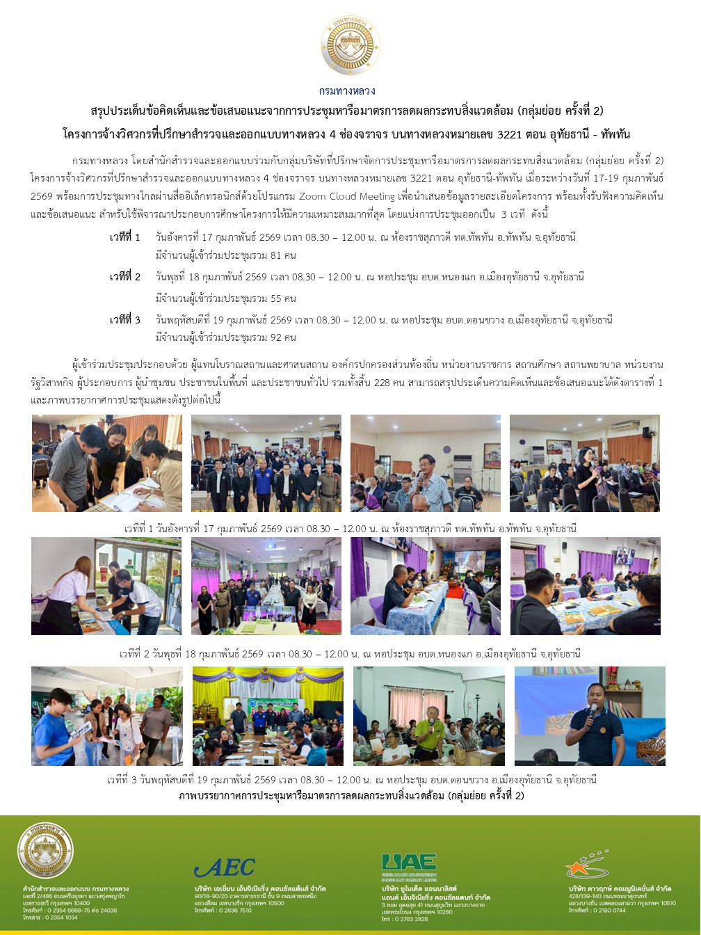 กรมทางหลวงขอเชิญเข้าร่วมการประชุมสรุปผลการศึกษาโครงการ (สัมมนา ครั้งที่ 3) เพื่อนำเสนอสรุปผลการศึกษาของโครงการทั้งด้านวิศวกรรม รูปแบบการพัฒนาโครงการ ผลการศึกษาด้านสิ่งแวดล้อม และผลการดำเนินงานการมีส่วนร่วมของประชาชน และร่วมแสดงความเห็นและข้อเสนอแนะอันเป็นประโยชน์ต่อการปรับปรุงผลการศึกษาให้มีความเหมาะสมยิ่งขึ้น ในวันพุธที่ 22 เม.ย.69 เวลา 08.30 – 12.00 น. ณ ห้องรุ่งอรุณ โรงแรมธาราฮิลล์ อุทัยธานี อำเภอเมืองอุทัยธานี จังหวัดอุทัยธานี พร้อมการประชุมผ่านโปรแกรม Zoom